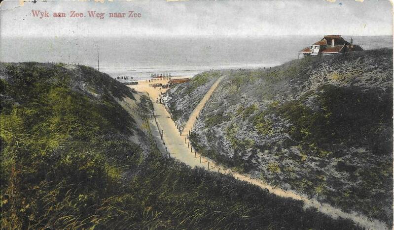 Rechts een foto uit 1925 waar men naar het strand liep vanaf de bos weg foto rechts waar men met de boot uit Amsterdam kwam en via de bosweg naar het strand liep